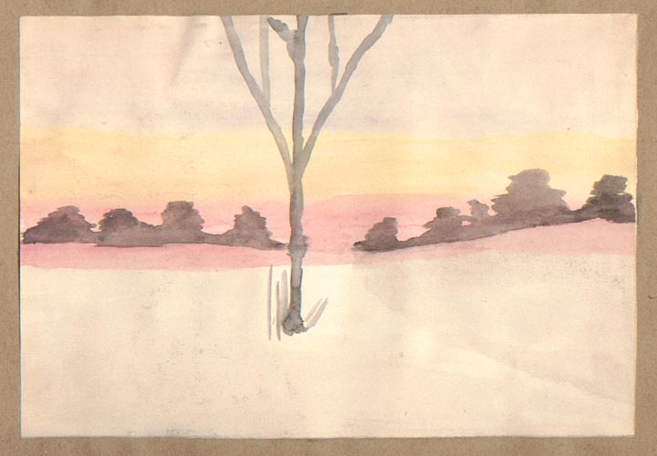 Virginia Love was a girl who lived in St.Louis, MO. in the 1940's. Most of her work was done in watercolor. Some was cutout paper collage, and some pen and ink sketches. Her work reflects her time (wartime rationing, period advertising), her surroundings (watercolor landscapes and still lifes), and her studies (Latin, geometry).