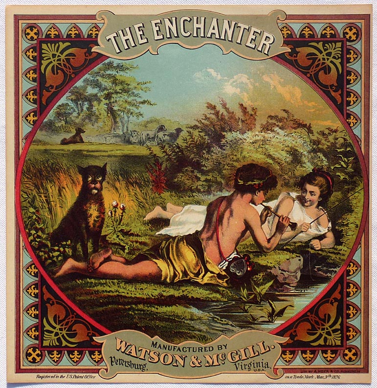 "The Enchanter" "Manufactured by Watson & McGill, Petersburg, Virginia, USA" is 10" wide by 10 1/4" high, in near mint condition. The price is $95.00. Inventory Code: CTOA. "The Enchanter" tobacco crate label ... Back ... With a 12" ruler for scale.
