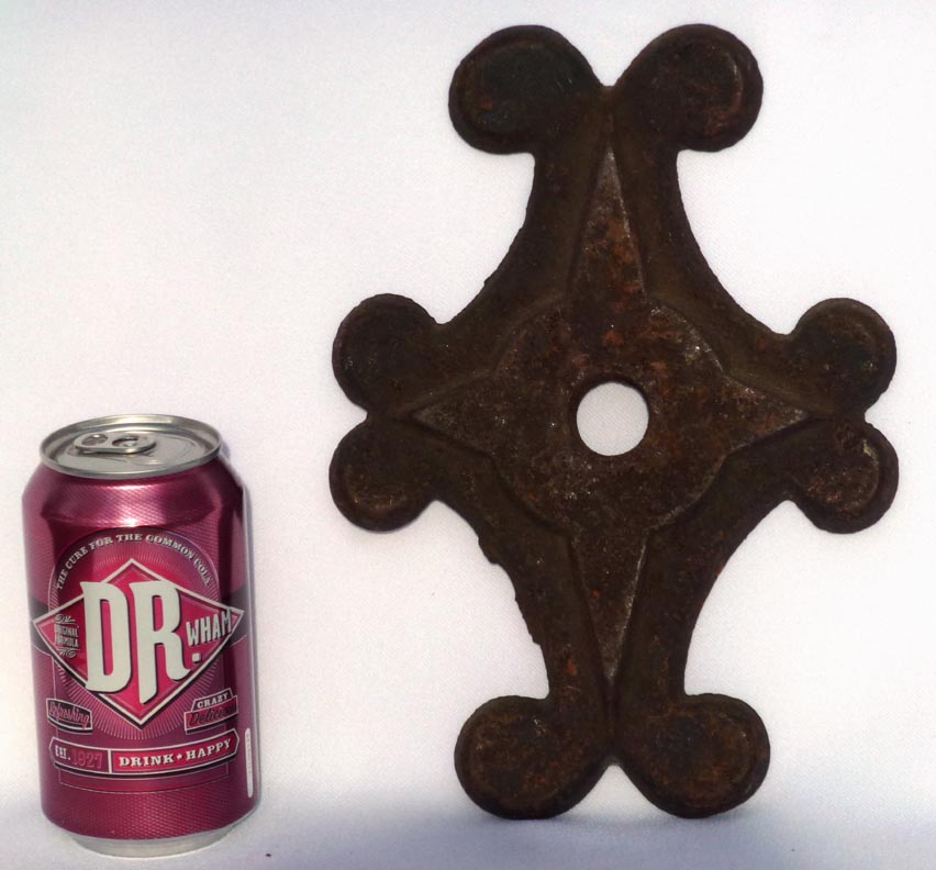 Some much larger photos: Cast iron architectural tie-in ... Side view ... Back view ... With a soda can for scale.