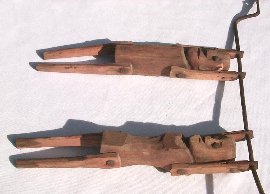 Here is an exceptional pair of jointed limberjack carvings - a man and a woman. They have strong, primitive faces with carved ears and metal tacks for eyes. The hands are inset metal tabs which are free to turn around the iron mounting bar. These carvings are from the late 1800's or early 1900's, with well oxidized surfaces and good patina. They are in excellent condition. Each person measures approximately 10" high by 2" wide by 1 1/2" deep; total width including the bar is 19 3/4". The price for the pair is $675.00. Inventory Code: ARPP. Pair of limberjack carvings ... Another view ... Closeup of both ... Closeup of the woman ... Closeup of the man ... Sitting ... One side ... The other side ... With arms down ... Another view, arms down ... From above ... Side/back ... Back view ... From below.