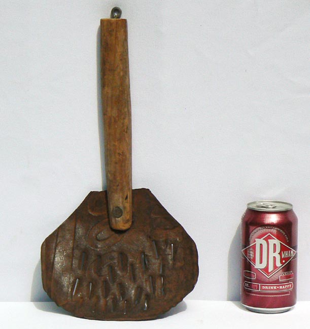 This is a very nice, old "make-do" dipper, made from a tin sign which still has the remnants of stamped letters. It is attached to a hand carved wood handle through a slit in the end and held by a nail through both handle and metal. The dipper has slits cut so liquid could drain out. This primitive piece was probably made in the early 1900's. It came from the upper Midwest, is in very good, old used condition, and is about 14" long with a width of 7" to the clam shell shaped metal. The price is $150.00. Inventory Code: TOKH. Hand made dipper ... Side and back views ... Another side view ... Closeup ... Another closeup ... Closeup of back ... Another closeup of the back ... From above ... From below ... With a soda can for scale.