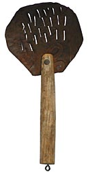 This is a primitive home made rake with a great funky look. The handle and cross piece for the tines are are hand fashioned from hardwood. The tines are heavy metal spikes which were tapered toward the ends. These were driven into the wood crosspiece, which also has bolts put through it at the ends to prevent splitting and a wire support for strength and stability attached to the handle. The rake is strong and was used. The handle is smooth from use; the iron well oxidized; and the cross piece obviously worn from work. It was probably made in the early 1900's or late 1800's, has a great surface, and is 43" long by 14 1/2" wide by 6" deep. The price is $225.00. Inventory Code: CSKA. Primitive hand made rake ... Closeup ... Another closeup ... More overall views ... Closeup from side ... Closeup from back ... Closeup, other side ... Sixth closeup ... Seventh closeup.