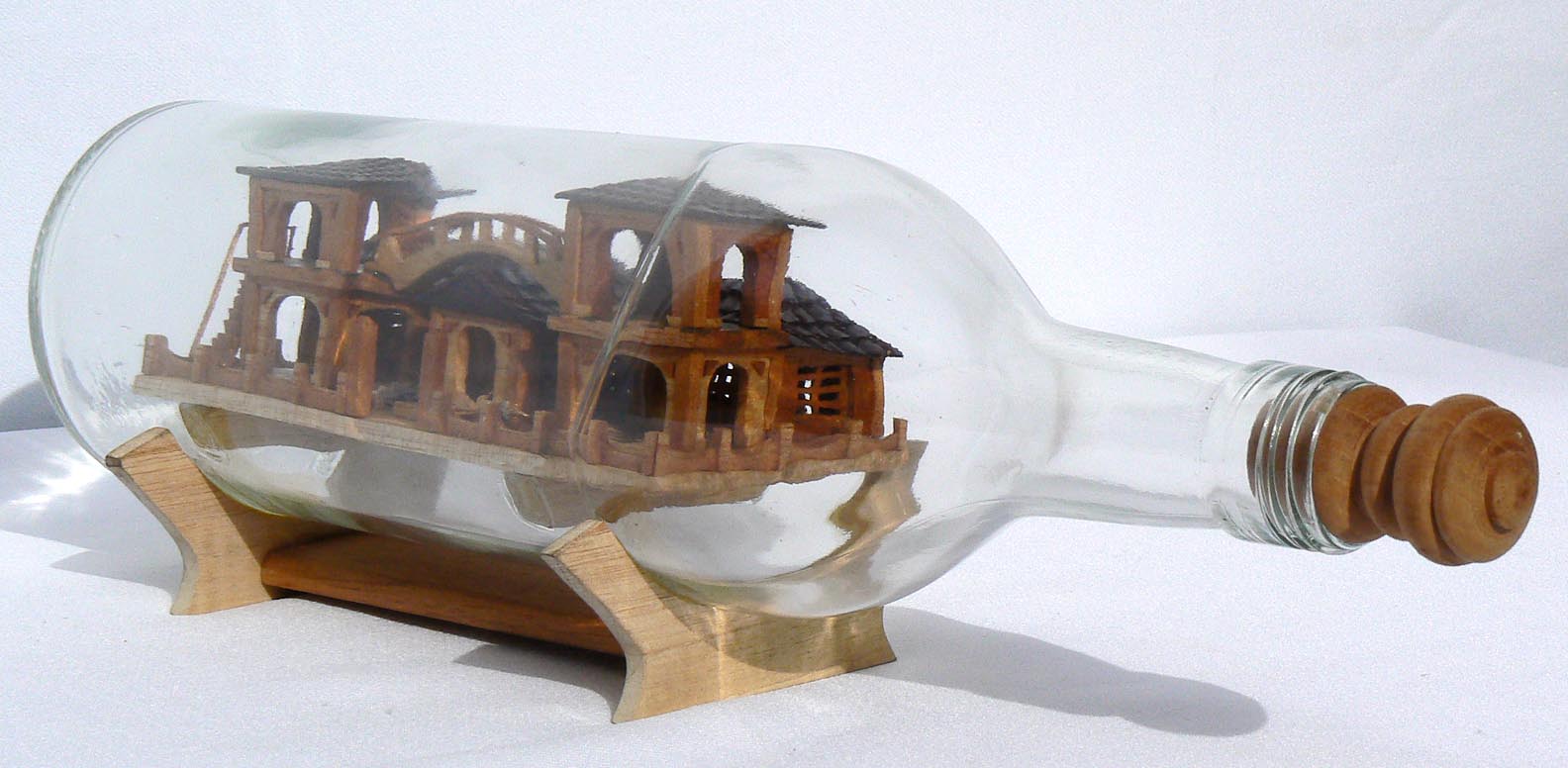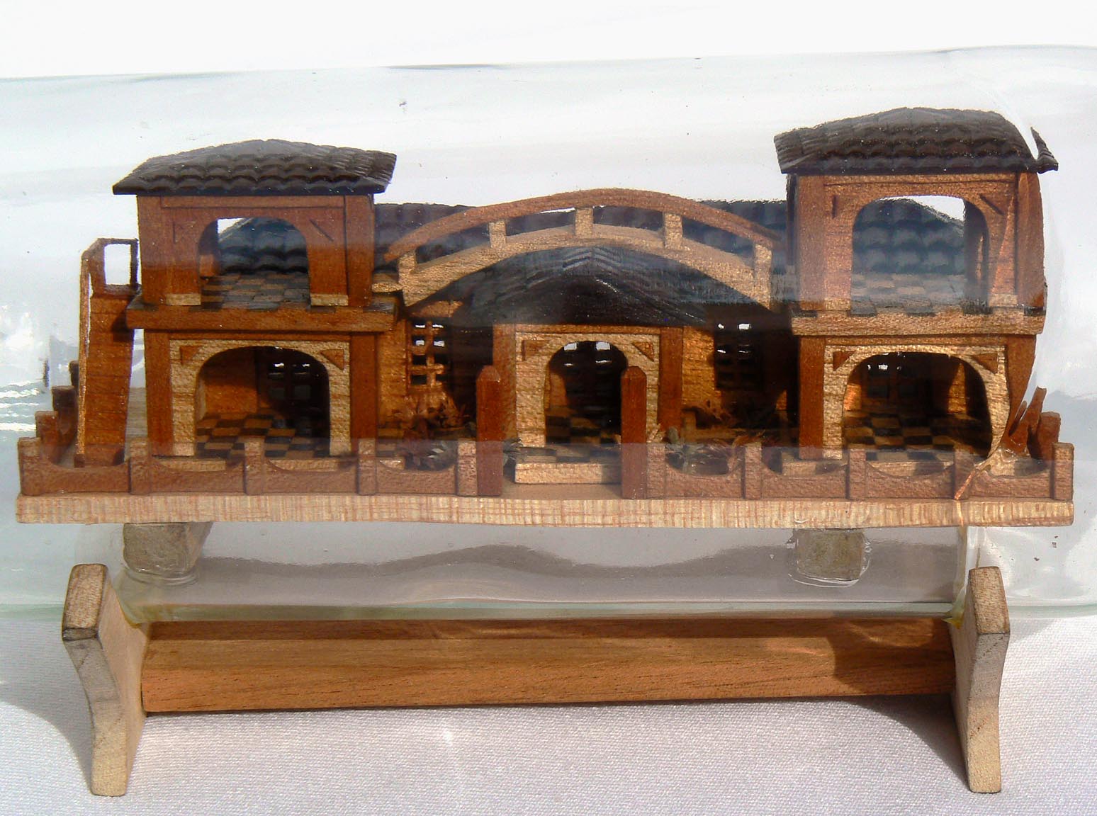 This is an extraordinary bottle whimsey of a house by Ramon Arbelo Gonzalez. The main portion of the house is a single story, with the addition of 2 two-story sections, connected by a bridge. The entire piece is done in great detail. The house rests on an open courtyard enclosed by a fence. Thread is strung through the fence posts as rails. There is an external staircase, shrubbery, and windows all around the four sides of the main house. All of the light and dark checkerboard wood which makes up the floor is actually inlaid in separate small pieces. The different colors of the squares are different kinds of wood. This is also true of the other shades of wood throughout this piece. On the bottom is inscribed information about the maker. It reads "Puky Omaja" and the town name he lived in in Cuba. The bottle is mounted on the base and is 13 3/4" long by 3" in diameter. With the base it is about 4" high. This piece was made in the early 2000's. While it is not that old, it certainly is exceptional. The entire structure is in excellent condition and can be shipped. The price is $850.00. Inventory Code: CSRC. Exceptional house in a bottle whimsy ... Closeup ... Another closeup ... Another angle ... Closer view ... A different angle ... Closer view ... Back view ... Closeup of back ... From above ... Another view from above ... End view ... From below ... Closeup of signature ... With a soda can for scale.