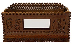 This is a hand cut fretwork wall box or comb case with carved decoration, dated 1927. The front has two hunters on the right and a floral design on the left, with a mirror set in between the two. Above the floral design are faint incised carvings of a dog chasing a rabbit. Under the mirror is carved "MCMXXVII". The back has a hand carved inscription "Made by the Wilton Novelty Co Wilton 10". The wood is probably walnut, with a machine cut molding strip of different wood across the bottom. It has an unfinished surface, although there are faint traces of green paint in the crevices. The mirror appears to have been replaced. The size is 11 3/4" wide by 7" high by 3 3/4" deep, and the condition is excellent. The price is $175.00. Inventory Code: CHTR. Carved fretwork comb case ... Another angle ... Two views from above ... Side views ... Back view ... Closeup of back ... With a soda can for scale.