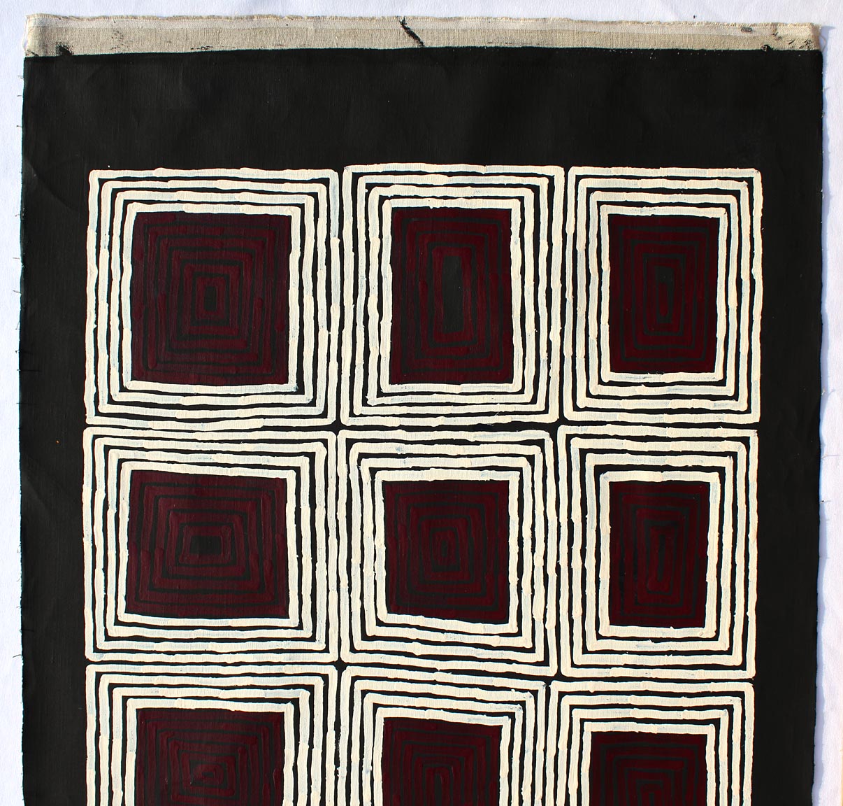 The second painting is in shades of red and dark pink. The price is $550.00. Inventory Code: CRWC. Painting by Gloria Petyarre ... Closeup ... Back view ... With a 12" ruler for scale.