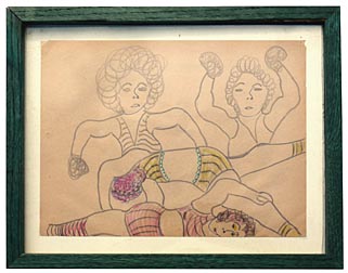 | Lewis Smith lived most of his life alone in the woods of Ohio; drawing, writing, and painting on paper, cardboard, and the walls of his house and buildings. His work reflects his preoccupation with muscular women (especially boxers and wrestlers), trains, time, and money. Lewis Smith passed away in 1998. He was in his mid 90's, living in a nursing home. He was reclusive, refusing to speak to almost anyone. When he left his home years ago, the only things he wanted to take were some of his drawings. He decided to let them go shortly before his death. We have over 400 pieces. Sample illustrations available by mail or on his web site. Lewis Smith's work was included in the show and book "ABCD: A Collection of Art Brut". |