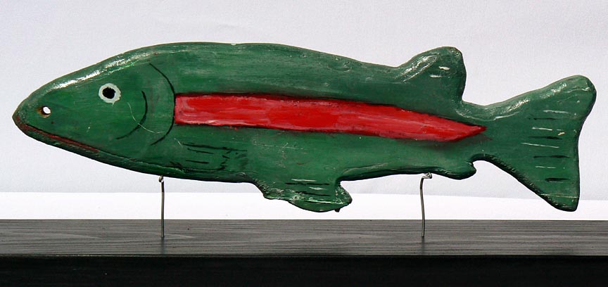 Here are two painted wooden fish decoys. They were cut from 3/4" boards and shaped with a router, then painted in greens, red, white, and black. Each is painted a little differently, and each has a hole through the front for a line to be attached. They range from 12" to 12 1/2" long, and from about 3 1/2" to 4" high. While not extremely old, they do show some oxidation and weathering from age and use. TOHC is in very good, used condition. The other (TOHT) was broken and reglued at the bottom of the fin and the bottom tip of the tail. They are priced at $75.00 each. Inventory Codes: TOHC and TOHT. Fish decoys ... The other side ... From above ... Front view ... Back view ... From below.
