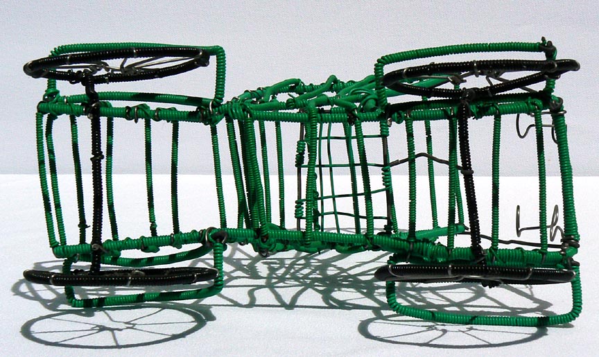 This is larger than many of the other vehicles and is more of a limousine than a car. It has 6 wheels, side doors, and is made from blue, black, and red wires. This piece is about 18" long by 5 1/2" wide by 7" high. The price is $225.00. Inventory Code: CSHK. Telephone wire limousine by Clifton Eugene Dale ... Another angle ... The other side ... Fourth view ... Closeup of detail ... Front views ... Back view ... From above and below ... With a soda can for scale.