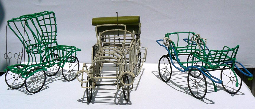 This white touring car is large and very detailed. It is about 13" long by 7" high by 6 1/2" wide and has a vinyl top covering the rear seat, with a "spare tire" on one side. The price is $225.00. Inventory Code: TWOS. Telephone wire car ... Side view ... The other side ... Front view ... Another front view ... Back view ... Another back view ... From above ... Top view ... From below ... With a soda can for scale ... Three cars together ... Front view of three ...