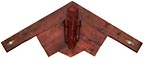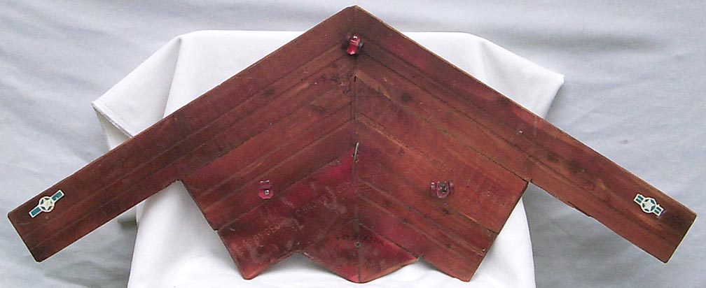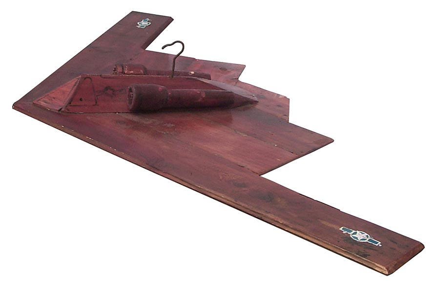This is a folky, Stealth Bomber model hand-made from thin tongue and groove wood, with an old varnish surface. It is decorated with stripes and stars cut from newspapers, and has further detailing done in marker. The plane has two sets of metal wheels screwed to the bottom. The third set has the bracket, but the wheels are missing. It was made by Oliver Rzick and is signed and dated 4-24-99. This plane is 16" long, about 3" high, has a wingspan of about 41". It is in very good condition. The price is $250.00. Inventory Code: AWKO. From above ... Overall ... Side view ... Closeup ... Another closeup ... From below ... Closeup of bottom.