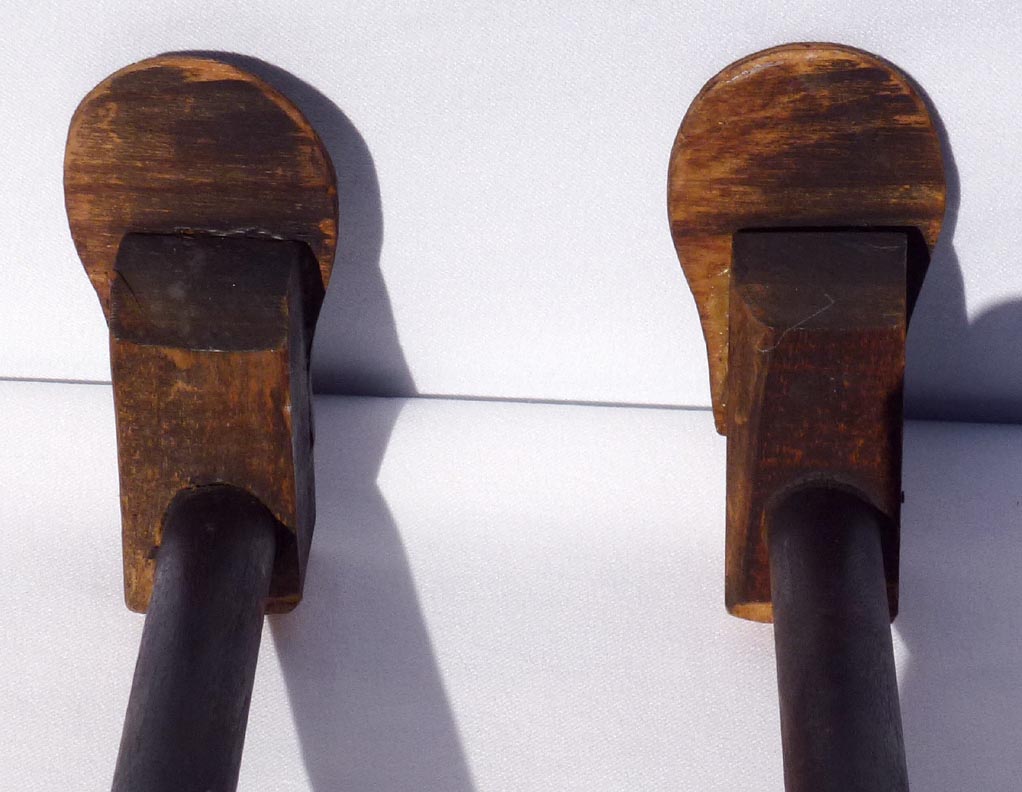This is an old hand forged cobbler's tool which was used by putting the end of the wood piece under the arm and then leaning down on it to put pressure on the object being worked. From the 1800's, this piece has a wonderful surface - worn, rich, and with a great feel. We are not sure specifically what use it had, but the "business end" is rather sharp, so likely for cutting of some sort. The entire tool is 18 1/2" long by about 8" wide. The handle is 1 1/2" thick at the widest part. It is in very good, old, used, condition. The price is $120.00. Inventory Code: TWHS-B. Cobbler's tool ... Two more views.